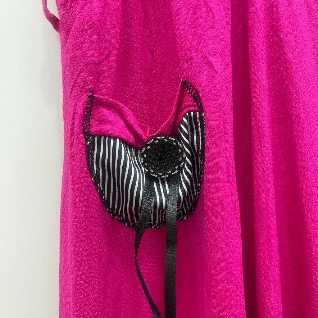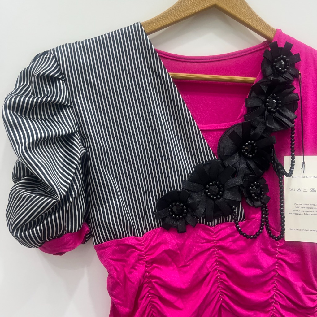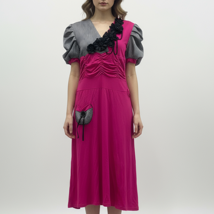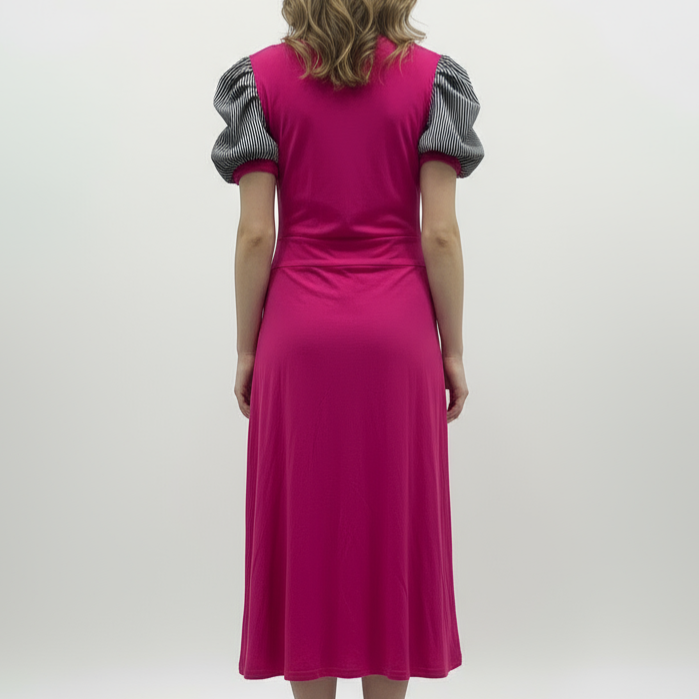 توضیحات: قسمت راه راه لباس از جنس ساتن و بدون کشسانی بوده و قسمت سرحابی رنگ نخ پنبه است و قابلیت کشسانی دارد.