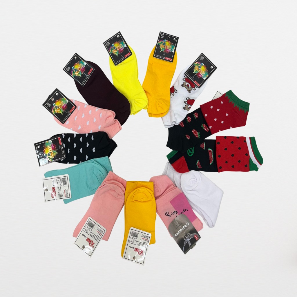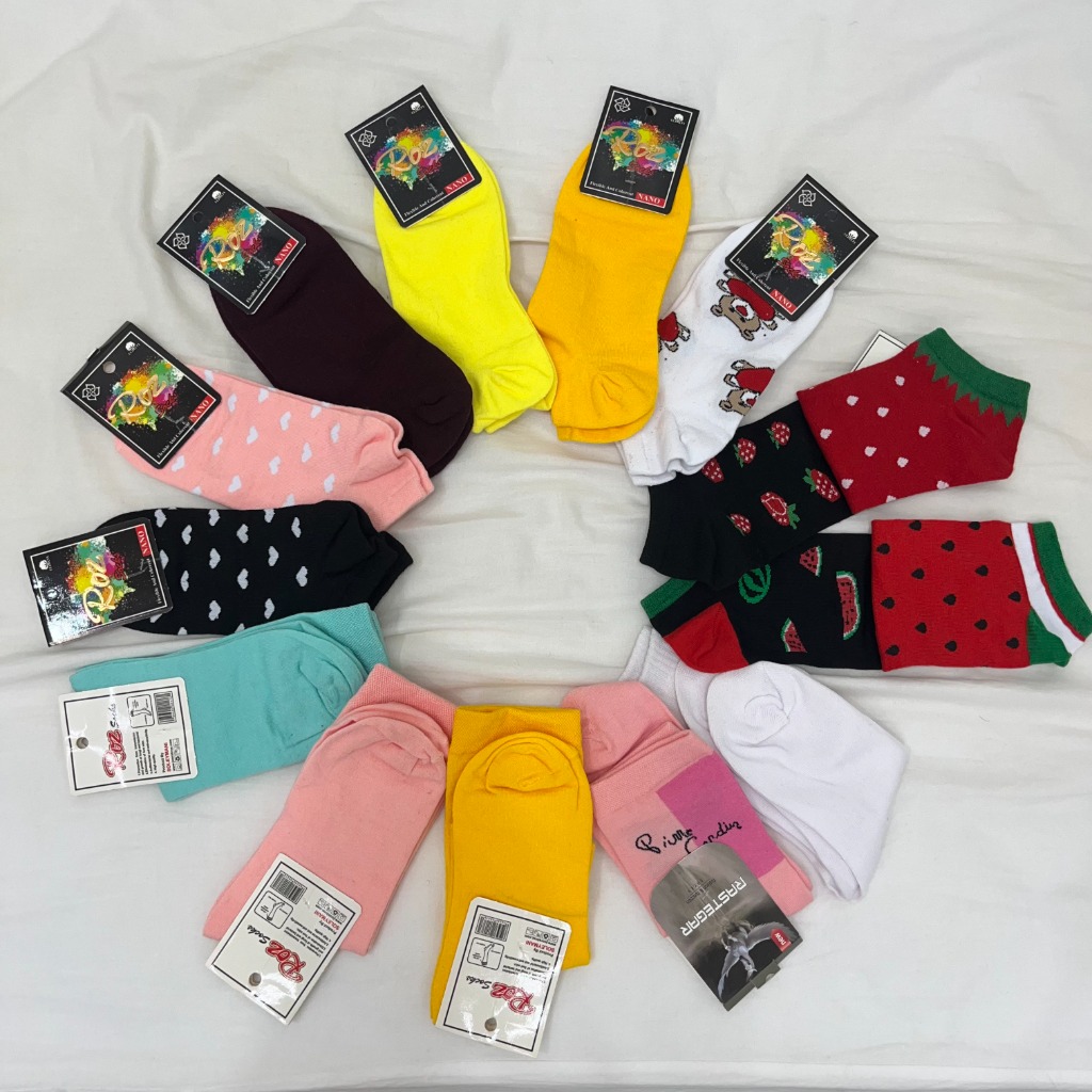 توضیحات: جوراب سفید ساق بلند به نسبت باقی جوراب ها نازکتر میباشد_ جوراب های طرح هندوانه و توت فرنگی به صورت لنگه به لنگه می باشند.